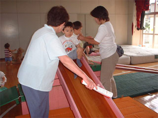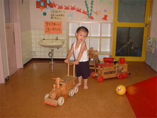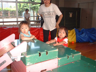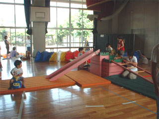 | ★子供たちが楽しそうに遊ぶ、「わくわくランド」(木曜)におじゃましました。 暑い日でも、ここなら元気に遊べます。お母さんにもありがたいですね。 |